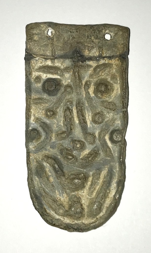 Finding images intended to represent Thor is more complicated. Of course, Thor has his hammer, called Mjölnir, as a symbol. Many examples of hammer pendants have been found over the years—in gold, silver, bronze, bone, lead. In fact, some were probably made of wood, although long-term survival was always unlikely. However, exchanges with experienced metal detectorists, and by extension with UK Finds Liaison Officers, suggest that some artifacts found with more abstract faces were intended to represent Thor. These are in some cases clearly representative of the “hidden faces” inclinations of Norse craftsmen as I have written about in The hidden face motif in Viking Age artefacts.