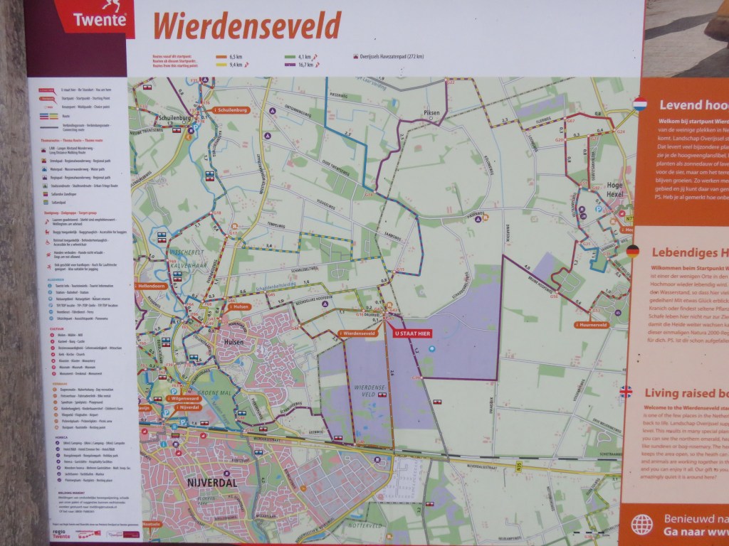 Allereerst waarschuwt ons een typisch Nederlands informatiebord ons voor deze hond. Deze kuddewaakhond, een Pyreneese berghond, is in het leven geroepen in verband met de terugkeer van de wolf. Zo ook in Overijssel. Iedereen zou voor deze hond bang kunnen zijn, maar ik kan dit niet. Lang geleden had ik zelf zo’n hond en dat was een schat van een dier. Rechtop staand kon hij zijn poten zó op mijn schouders leggen en kon je met hem dansen door de woonkamer.