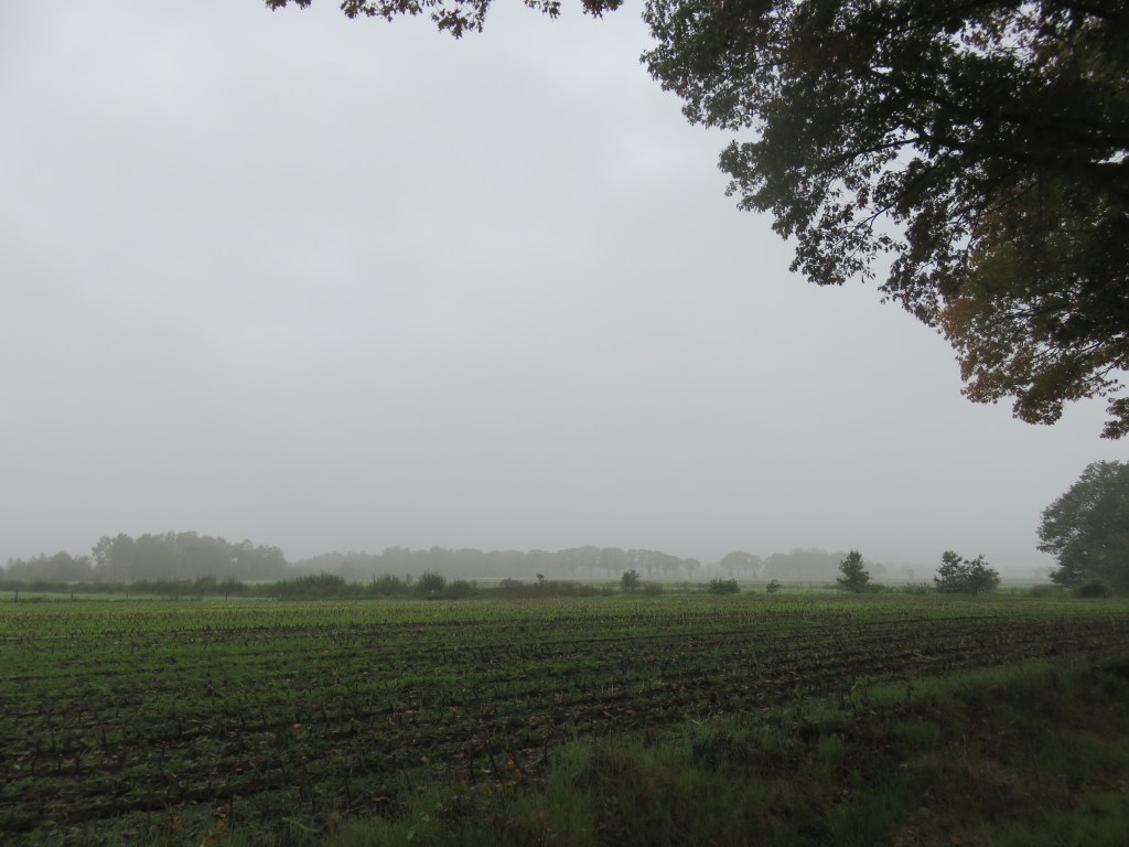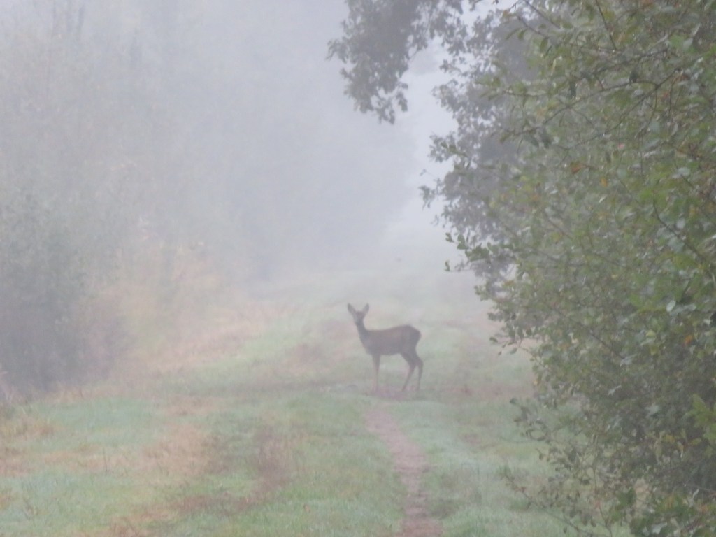 Opeens rent er iets over het pad de bosjes in. ‘Het leek wel een hond’ hoor ik mijn vrouw zeggen. Dat moet dan een loslopende, wilde hond zijn. Gauw bekijk ik ter plaatse de sporen in de grond. Ik zie vaag een paar hondensporen, maar ook sporen van een hert. Verderop in een weilandje zien we het hert staan. Even later steekt er weer een over en deze blijft verbaasd kijkend naar ons, even stil staan. Van ver is het net een schilderij in de nevel.