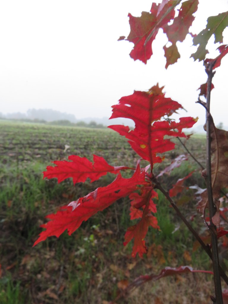 Langzamerhand komen we aan het einde van onze wandeling. We kijken nog even op een uitkijktoren naar de lucht, maar heel veel spannender wordt het niet. Galwespen hebben hun nageslacht ondergebracht onder eikenbladeren en in fel rood schijnen ze ons tegemoet.