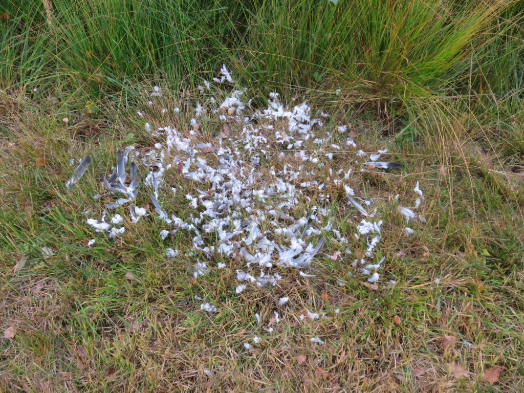 Daar zal de houtduif die hier geplukt is, wel zijn eigen gedachten over gehad hebben.. Op de heide ben je als vogel, met de havik in de buurt, nooit echt veilig natuurlijk. Tenzij je zo groot bent als een kraanvogel.