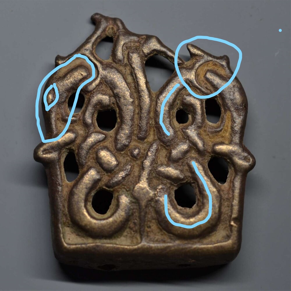 Zoals bij het hierboven getoonde stijgbeugelriem beslagstuk te zien is. Zowel Ringerike stijlelementen – de zeer stilistisch weergegeven drakenhoofden/bekken zoals aan de rechterzijde met blauw omcirkeld, alsook Urnes stijl elementen, zoals de langwerpige dier/draakhoofden aan weerszijden, zoals omcirkeld aan de linkerzijde, met voor de stijl kenmerkende amandelvormige/langwerpige ogen. De stijlen zijn hier zo sterk en verfijnd uitgebeeld dat dit beslagstuk zonder meer ‘viking’ genoemd kan worden. Of het nu door een smid uit Scandinavië, ofwel door een Angel-Scandinavische smid. Dit was geen half werk of slap aftreksel van een Angelsaksische smid, die iets wilde maken in de stijl van de smaak van de Scandinavische handelaren die Engeland bezochten of van oorsprong Scandinavische inwoners van de door vikingen uit Scandinavië bewoonde gebieden in Engeland. Stijlvastheid en puurheid zijn niet te faken. Dit is het echte werk.