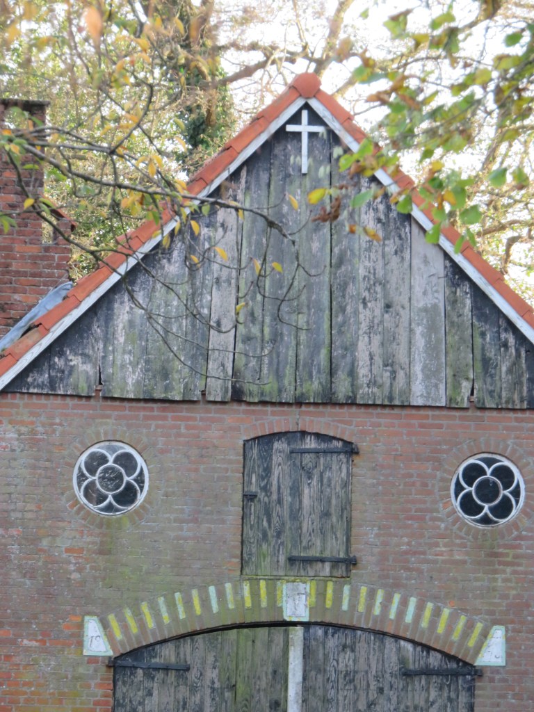 Even verderop is een boerderij te zien met zowel christelijke als voorchristelijke symboliek: het kruis naast de klaverblad symbolen in de ronde ramen.