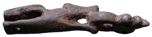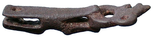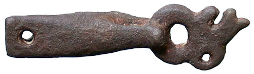 ‘It does appear to be a strap-end in the form of some kind of canine, wether a dog or wolf, as yousuggest, catching a snake in its jaws. Could it be Fenrir, up to his tricks, maybe? Viking examples ofthe type are usually decrated in the Urnes style, but this more is more naturalistic, so is presumablylate in the series, later 11th centuries and stylisticaly in the Viking/Norman range’.