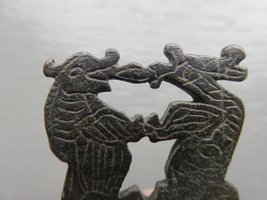 Het voorwerp hier afgebeeld is een zogeheten paardentuig sierhanger. Althans: dat staat in de beschrijving. Met ongeveer 2.400 vondsten uit de vroege en late(re)middeleeuwen aangemeld in het Portable Antiques Scheme, is het een met zekere regelmaat teruggevonden type voorwerp, maar zeldzaam in de vroegmiddeleeuwse periode. Deze paardentuig sierhanger, gevonden in Norfolk is qua datering aangeduid als ‘9e tot 11e eeuw’. Ik meen echter, stilistisch gezien, dat hij gedateerd kan worden als laat 11e eeuw of misschien wel vroeg 12e eeuw. Het Angel-Scandinavisch-romaanse uiterlijk laat zich zien in de vormgeving van de wolven. De opgerichte snuiten is een kenmerk van de Urnes stijl. Het stuk ademt nog steeds een (hybride of niet) Scandinavische herkomst maar ademt qua stijl de romaanse stijl, daar op volgend.