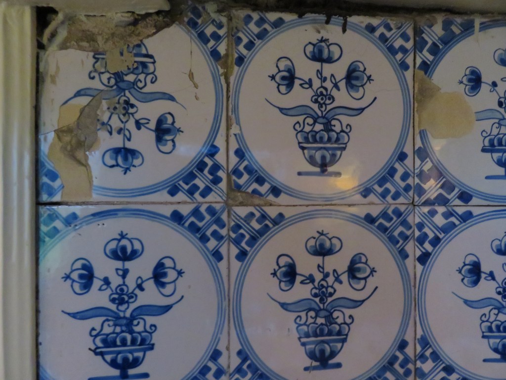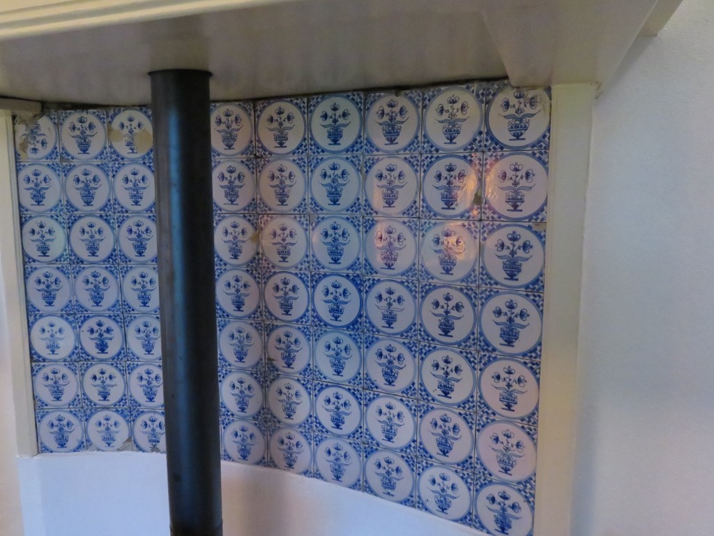 Frans wijst mij op een teken van bijgeloof. Eén tegel is ondersteboven in de schouw geplaatst. Dit is geen fout, maar opzet. Het gebruik blijkt zelfs in het verre zuidoosten van Europa te bestaan. ‘Niets is perfect’ is hierbij de gedachte. Om alvast de ‘zegening’ van de wél op de juiste manier geplaatste vervolgtegels te krijgen, werd de eerste op deze wijze andersom geplaatst? In ieder geval werd het in de tijd als onheil afwerend gezien.