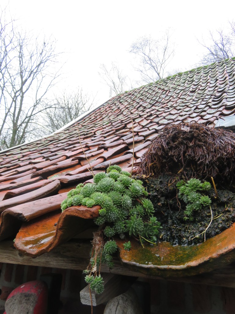 Nu wist ik dit wel, maar hoe werkt dat dan? Frans Jacobs is de eerste die het mij helder en geloofwaardig weet uit te leggen. Door aan één zijde het rieten dak (of pannenbedekking) zo groen mogelijk te houden (mos, huislook) creëert men aan deze zijde een vochtige kant. Raakt bliksem het dak, dan wordt deze via de vochtige dakzijde afgevoerd en slaat deze niet in het huis in. Een bliksemafleider avant la lettre dus.
