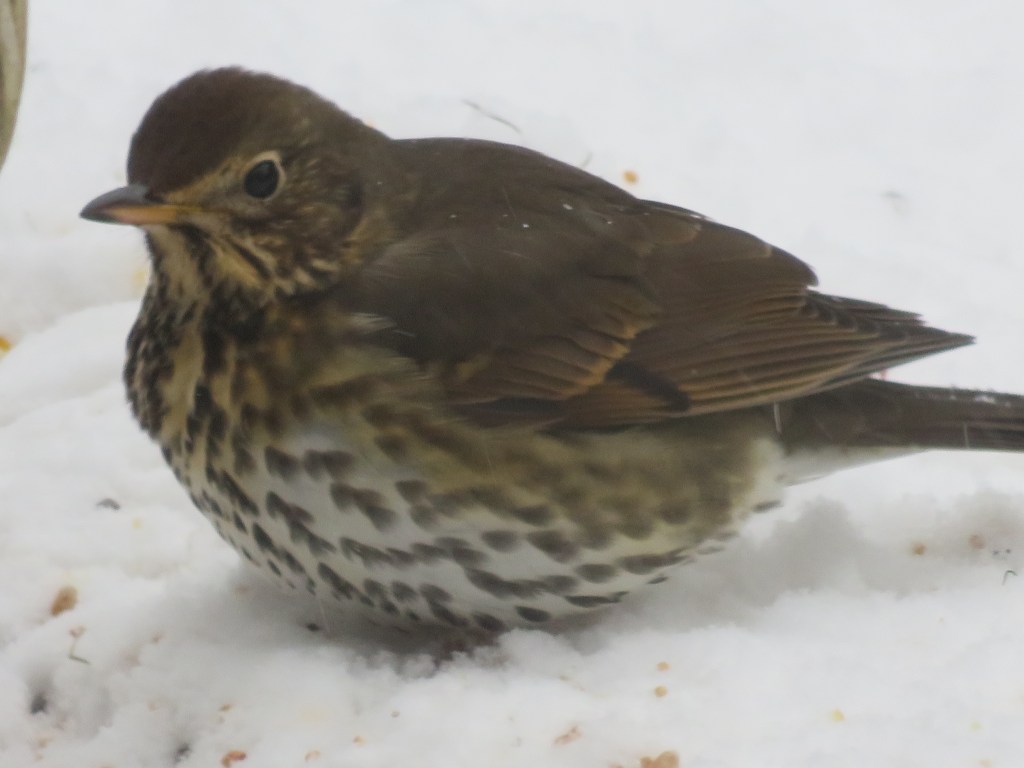 Het is zelfs zo bar, dat er zelfs een zanglijster in de tuin zich aansluit bij het gezelschap. Normaal nog steeds de meest schuwe onder de lijsterachtigen. Ik hoor hem wel eens zingen in voorjaar en zomer, maar altijd op afstand. Hij komt nooit in de tuin.