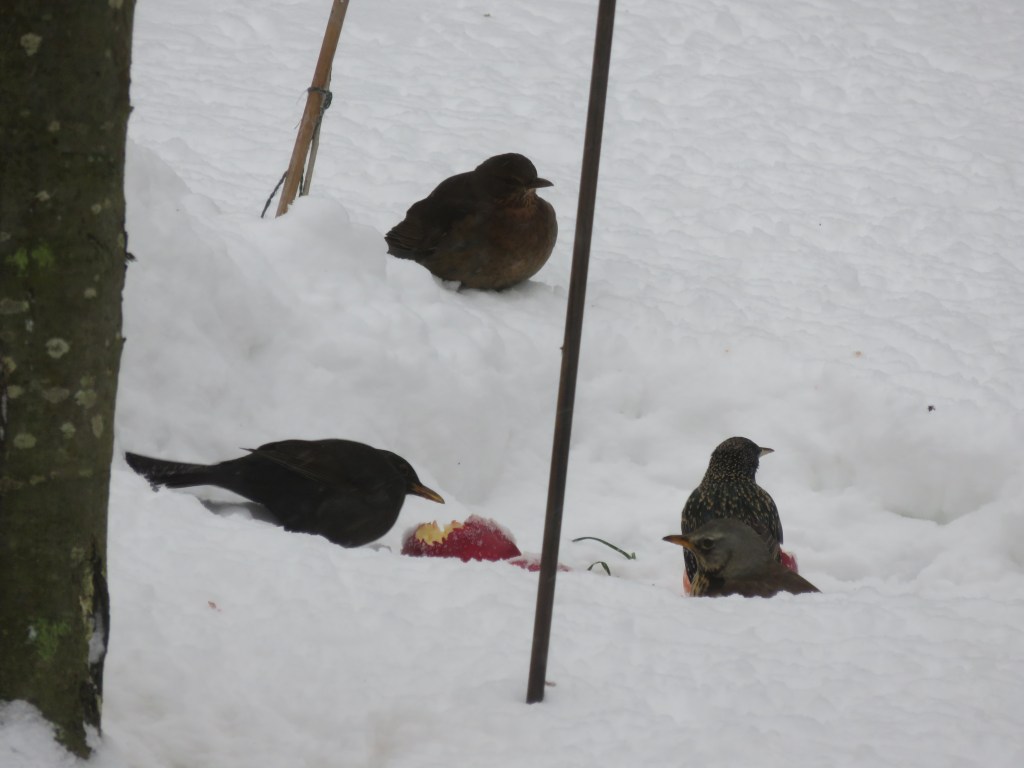 Met de kramsvogels zijn er een paar fanatieke klanten in de tuin gekomen. De staart wordt breed uitgezet, en alles en iedereen die in de buurt komt, wordt verjaagd. De merels onderling kunnen er ondertussen ook wat van. En dan mengen de spreeuwen zich ook nog in het voedselgewoel.
