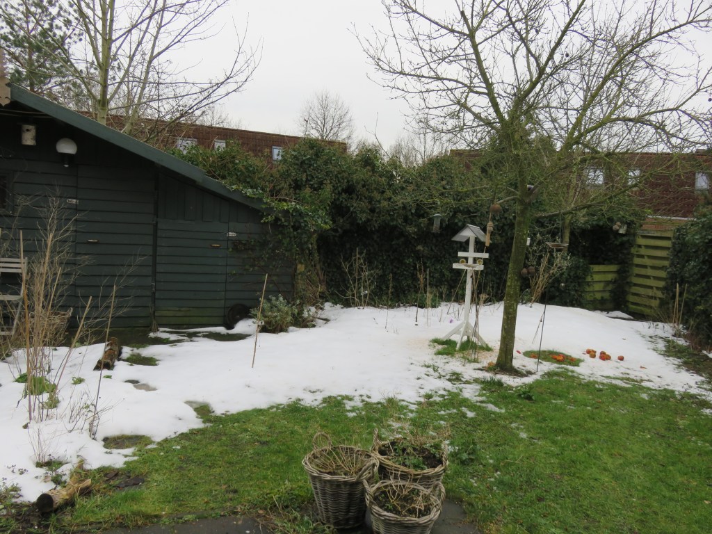 Alle planten die ik letterlijk, ingepakt had heb ik weer uit hun benarde positie gehaald. Het is afwachten wat de schade is. De ene mand met aarde was zacht, de andere, althans aan de oppervlakte een permafrost. Ik hoop dat de jasmijnen nog leven in zich hebben en in mei gaan bloeien. Onder de sneeuw komen bloeiende sneeuwklokjes tevoorschijn en de crocussen, die wel spoedig zullen gaan bloeien met het zachte weer in aantocht. De tuin is, althans nú, goed voorzien van herfst- en winterneerslag. Het kan er weer even tegen. Zo lang er vanaf maart tenminste niet, zoals vorig jaar, máánden van droogte komen.