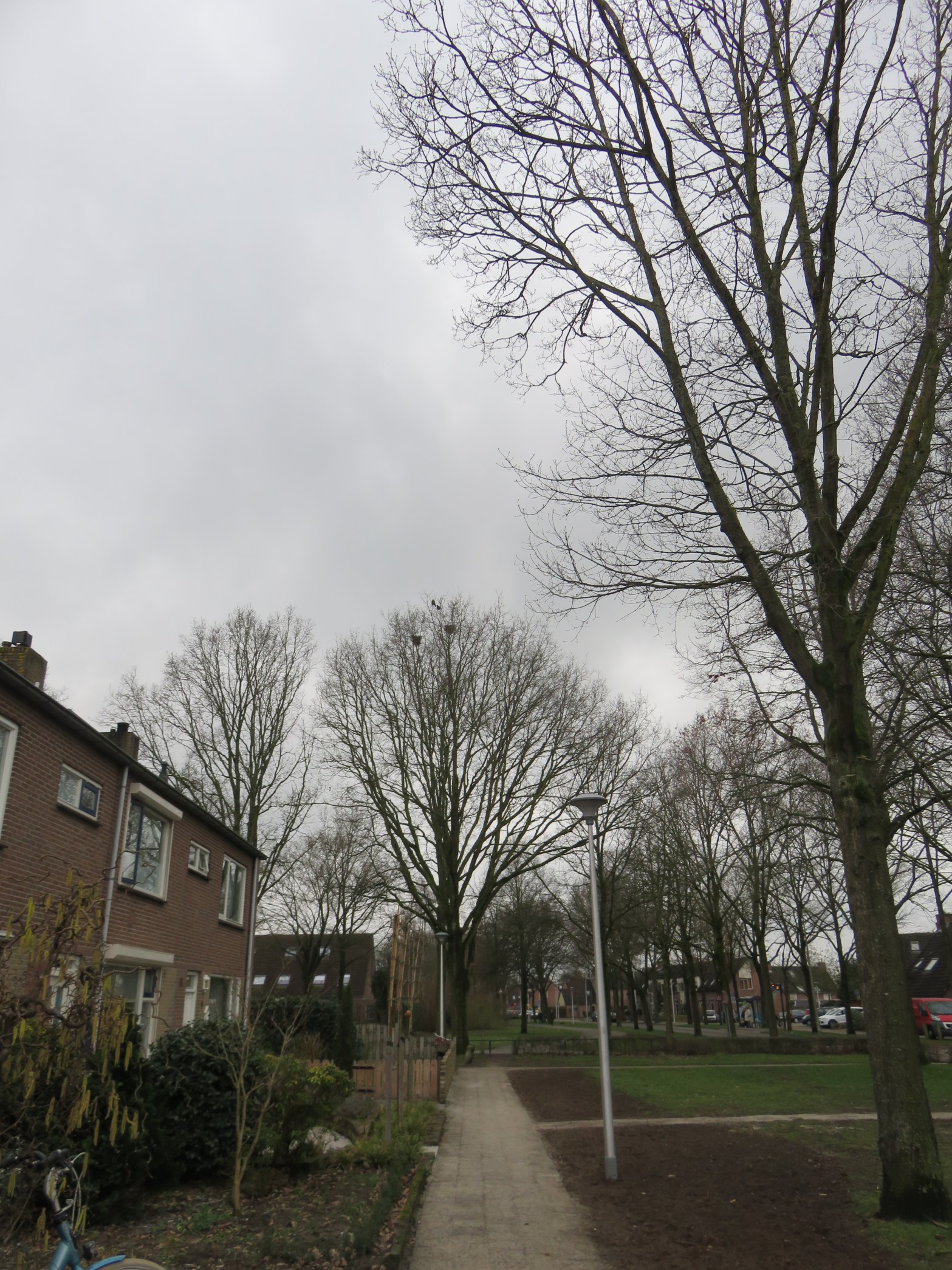 Opeens zijn daar dus twee nesten. Gaat deze uitgroeien tot een nieuwe kolonie? Mochten de nesten volgend jaar toch verlaten blijven, bieden zij een uitgelezen broedgelegenheid voor de ransuil, die al eerder hier vlakbij – in een vod van een oud kraaiennest – zijn plek gevonden had. Ransuilen zijn luie wezens. Maar geef ze ongelijk. Of zijn hun snavels eenvoudigweg niet er op gebouwd om met takken te gaan slepen?