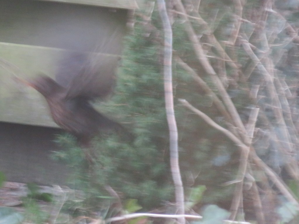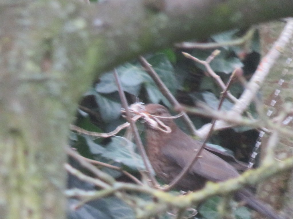 U zult zich afvragen; wat zie ik hier. Tja, vogels vliegen soms weg als je een foto neemt. Deze merel, want dat is het, is dinsdag druk begonnen met het bouwen van een nest in onze klimop. Vooral in de ochtend uren wordt er af en aan gevlogen.