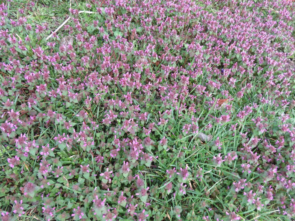 Op de zuidhelling van de dijk bloeit nu hondsdraf, op sommige plekken als een paars heideveld.