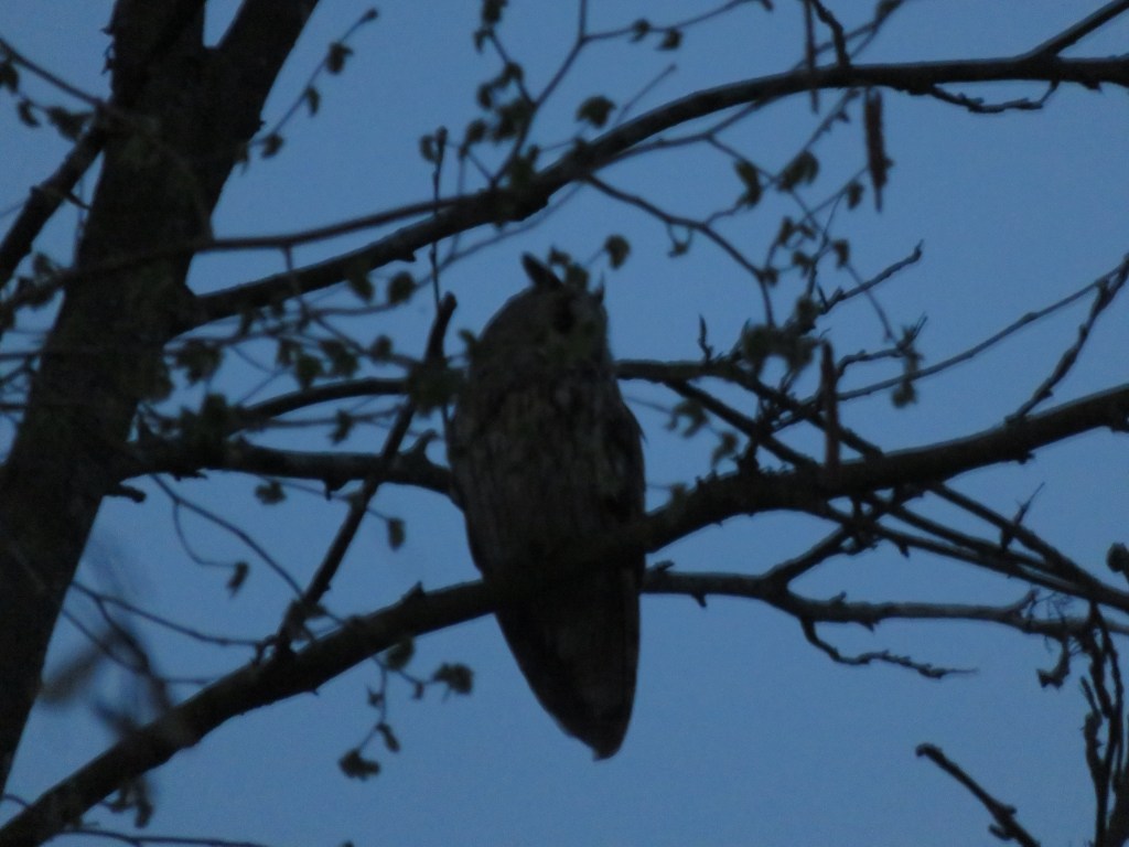 De avond er op weer gaan kijken. Het luistert nauw. Er is een soort ‘gouden kwartiertje’ nu, tussen 19.15 en 19.30 waarin ze zich laten zien. Het is het moment waarop de ransuil uit zijn ‘daagse verschuilplek’ komt, eens plaats neemt op een tak, zich uitrekt, de veren eens opschudt en eens bedenkt hoeveel trek hij nu heeft. Ze zijn beslist niet erg schuw, maar enige afstand blijft wel gepast.