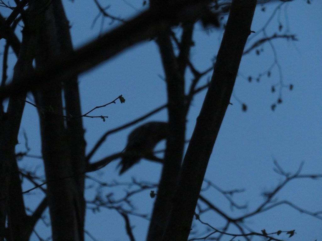 Dan, opeens, vliegt het mannetje weg. Het wordt helemaal donker en ze nog zien is bijna onmogelijk geworden. Het gouden kwartiertje is voorbij.