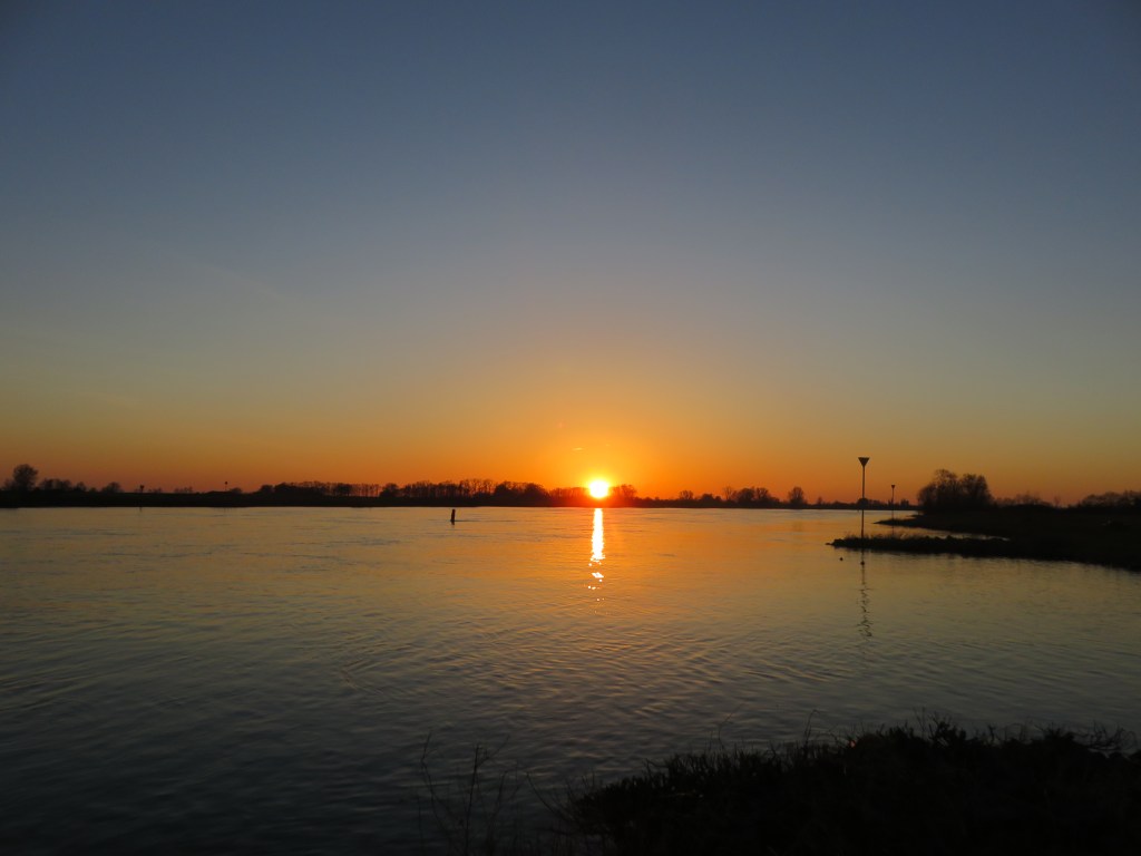 De zonsondergang boven de IJssel is al bijna van zomerse allure.