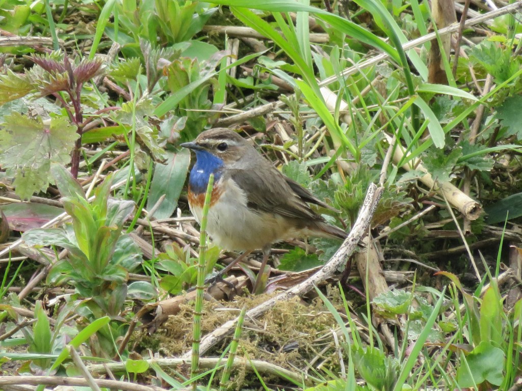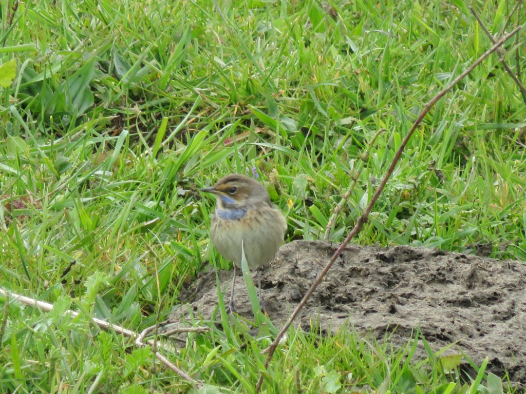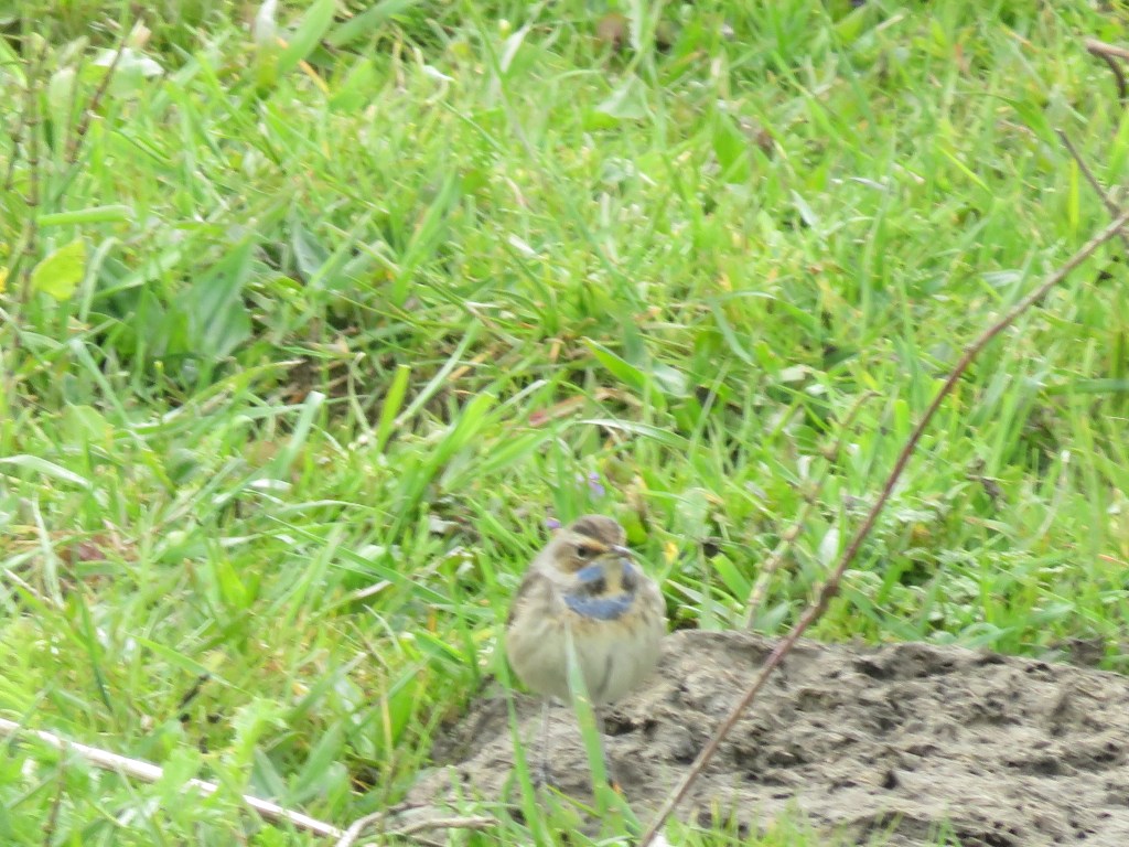 De verrassing van vandaag – dank, medevogelaar die ons hier op attent maakte – zijn niet één, maar twee blauwborsten, een paartje, wat zich op de grond in wat kruidachtig gewas ophoudt. Natuurlijk, het mannetje, dat zag ik vaker, maar al niet van zó dichtbij. Maar het vrouwtje? Ik kan het mij niet herinneren.