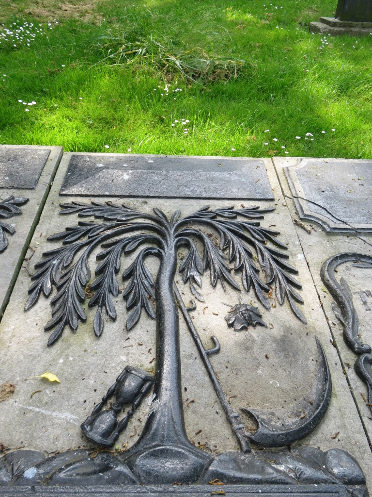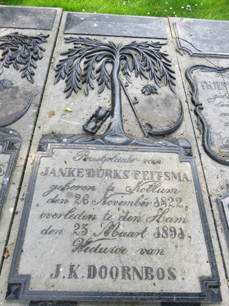 De symboliek is prachtig. De boom, een millennia oud symbool in de vorm van de levensboom, met daaronder een zandloper en zeis worden vergezeld van wat een blad lijkt welke uit de boom valt en terug transformeert in een vlinder welke weer opstijgt. De man met de zeis. Het grotere geheel wat jij onderdeel van maakte. Hóóguit. En niet andersom. Kom daar nog eens om tegenwoordig met foto op graf en persoonlijke toebehoren. Neehee, hier spande het er nog om. Overduidelijk.