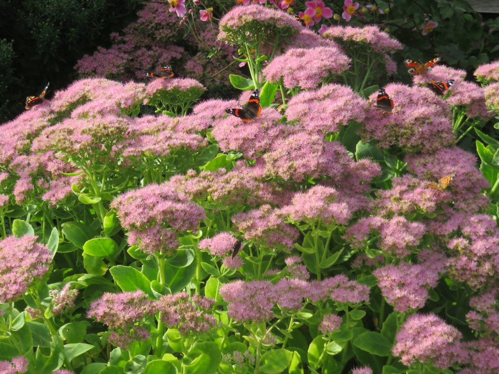 De zon breekt ook maar even door en gelijk zie je overal atalanta’s, een vlinder die nu bij tankt voor zijn lange reis naar het zuiden. Hij heeft een paar favoriete planten. Eén daar van is beslist de hemelsleutel, een sedum soort die nu bloeit. Ooit noemde ik deze plant septemberkoning, en dacht dat dit altijd een verzinsel van mij was, maar deze naam heeft hij dus ook. Septemberkoning klinkt lekker krachtig. Dan ben je de baas. De rest is van een tweede categorie. Alhoewel? De koning moet toch één keizer boven zich dulden.