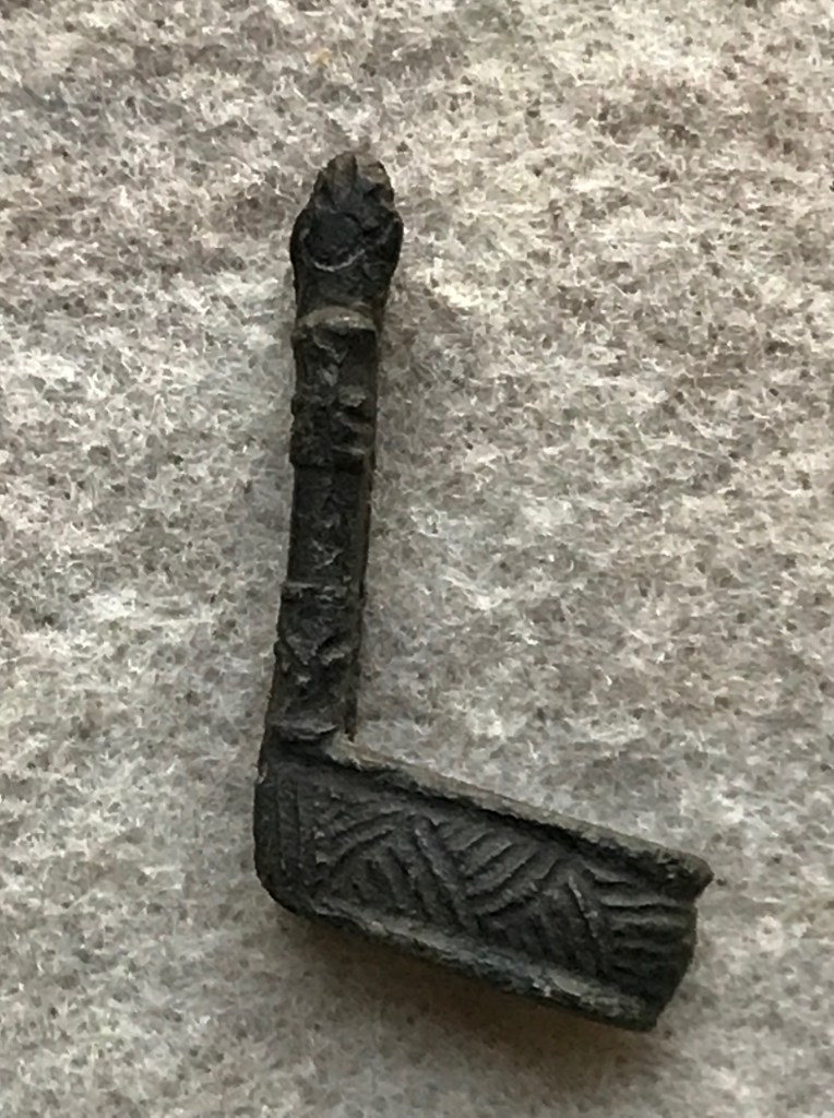 Aan de ene zijde zien we een zig-zag decoratie en op de kop van het voorwerp een diergelijkend uiteinde. Zowel qua vorm als qua decoratie zie ik geen Scandinavisch voorwerp of een hybride Scandinavische invloed zoals deze in de Angelscandinavische gebieden in Engeland in de mode was. Het zig-zag motief wijst eerder op een – zeer grof – weergegeven romaans chevron achtig motief.