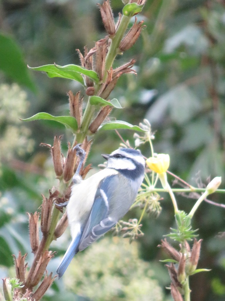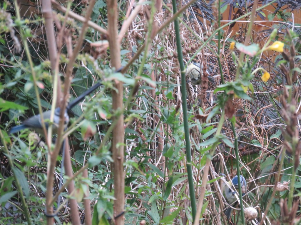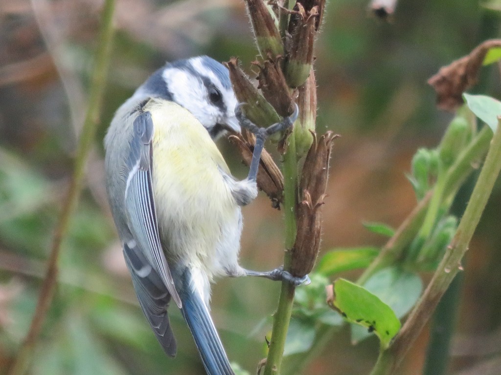 De pimpelmezen moeten, na het wat voorbarige gevoeder mijnerzijds in de nazomer en vroege herfst, weer even zelf aan de bak. Een stel tref ik op een middag aan in de uitgebloeide teunisbloem en venkel. Men begint opvallend vroeg aan de uitgebloeide zaden. Ik zou dit eerder ergens in januari verwachten.