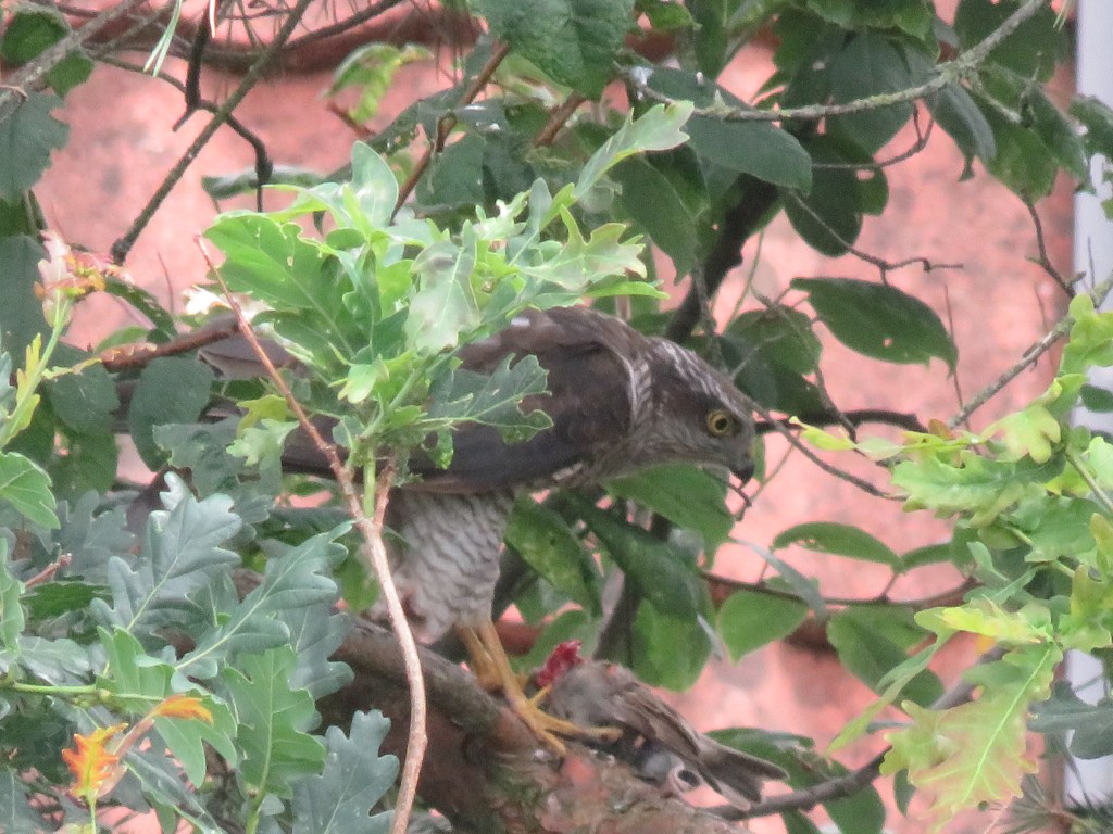 Na een minuut of 10 vliegt hij weg. En.. duikt weer op een week geleden. Het lijkt eerst alsof er een kat zich in de klimop vergrijpt aan een vogel. Maar het is de havik die een sperweriaanse vlucht neemt en zich op een zich snel verschuilende mus stort. Zonder succes. Hij gaat nog even in de esdoorn zitten, op nog geen meter of 5, 6 waar we buiten zitten en vliegt dan weer verder. De sfeer in de tuin is sindsdien iets voorzichtiger geworden. Ik zie ook opeens minder eksters en vlaamse gaaien.