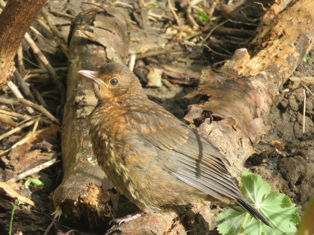 De volgende verrassing is als ik op een ochtend het geluid van een jonge merel hoor. Maar de verrassing zit hem in het feit dat deze onder zijn of haar hoede lijkt te zijn genomen door een eveneens jong ogende merel, die volgens mij nog dit jaar geboren moet zijn.