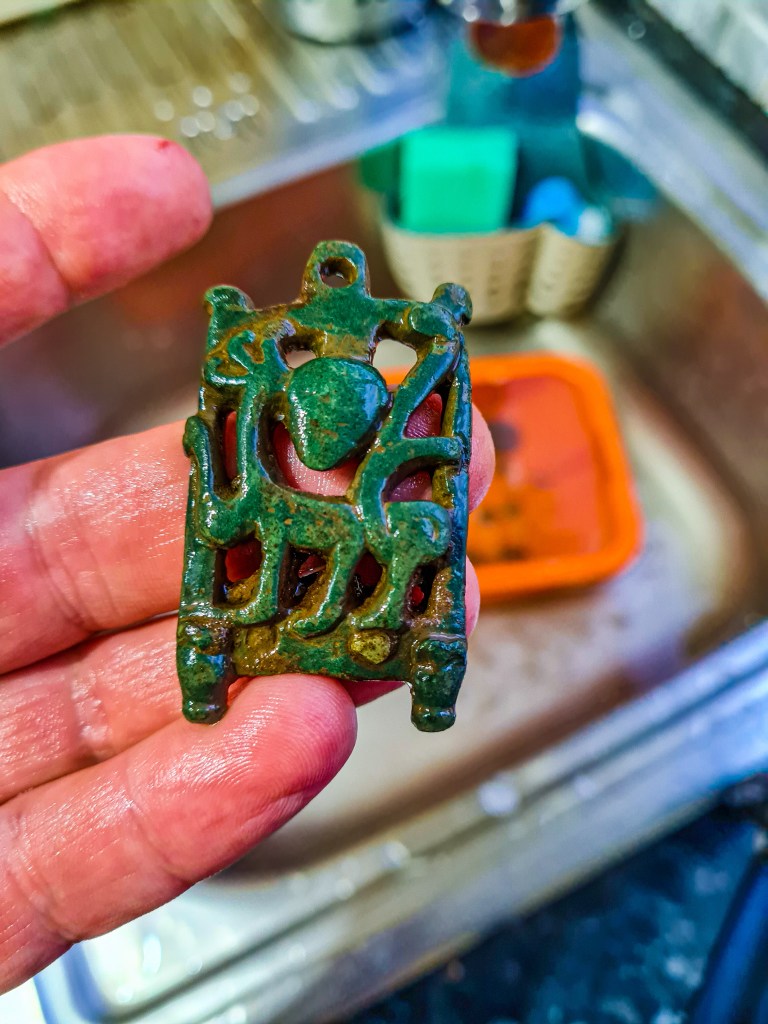 Het stijgbeugel riembeslag stuk wat pas gevonden is laat een geheel eigen, qua decoratietype voor mij nog onbekend, type zien.