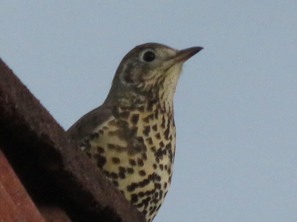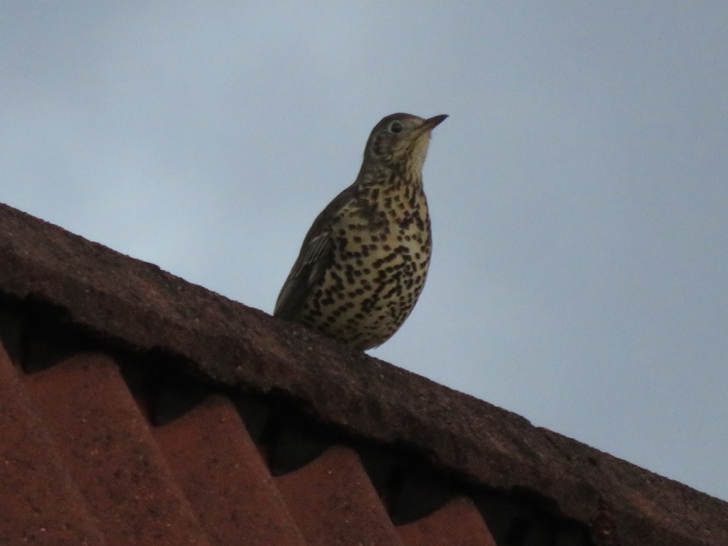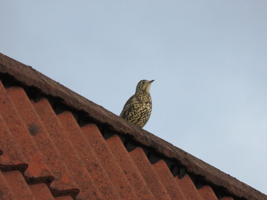 Terug lopend Westenholte hoor ik vogels alarm slaan. ‘Vast weer een sperwer’ denk ik. Hoe vaak er in Westenholte wel geen sperwers te zien zijn. Op een dak aan de Pepermuntweg zie ik een vogel zitten, maar ik zie het niet goed. Het lijkt toch geen sperwer, hij is te klein. Een lijster? Daar is hij weer te groot en statig voor. Het blijkt, als ik met mijn camera inzoom, een grote lijster te zijn !