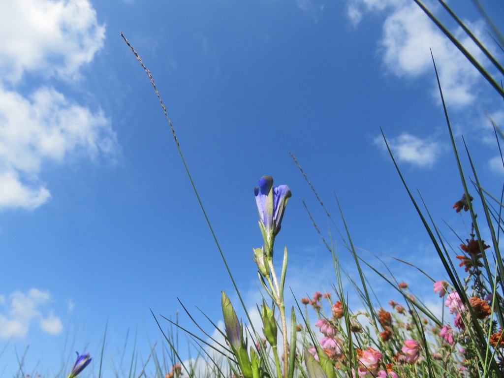 Hier is de heide nog écht paars. Veel dopheide naast struikheide. Eén van de bezienswaardigheden zijn hier het gentiaanblauwtje – een vlinder die zijn eitjes alleen op de gentiaanbloem af zet. Wordt iets fraaier als het er juist niet massaal is? We moeten goed zoeken, maar plotseling staat ie er: de klokjesgentiaan, om precies te zijn.
