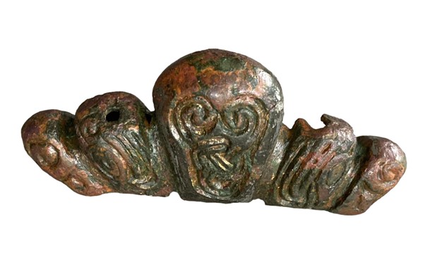 Het middenstuk laat een vervlochten decoratie zien, eigen aan de Jellinge stijl, die uit loopt in een – ogenschijnlijk – hartvormige spiraalvorm, zoals ik ook wel gezien heb op kleine beslagstukjes uit het Baltische gebied ten tijde van de Vikingperiode. Daarmee ademt deze pommelkap voor mij “twee werelden” uit. De – overduidelijke – wereld van de vikingen, gezien de decoratie en vorm van de dier(gelijkende) koppen én een deels Slavisch aandoende decoratie in de top van het middendeel. Het is Scandinavisch, maar ook weer niet helemáál. De binnenwaarts cirkelende vorm bovenaan het middenstuk doen denken aan een bronzen beslagstukje, gevonden in Grobina, Letland. De twee – als zwijnskoppen beschouwde – aan weerszijden hebben een hybride Jellinge / Borre stijl decoratievorm. Allereerst is het een geluk dat de decoratie zo goed bewaard is gebleven. Menig voorwerp is de laatste twintig jaar ernstig beschadigd en/of geërodeerd geraakt door het gebruik van kunstmest, die al te vaak een verwoestend effect heeft gehad op bronzen voorwerpen.