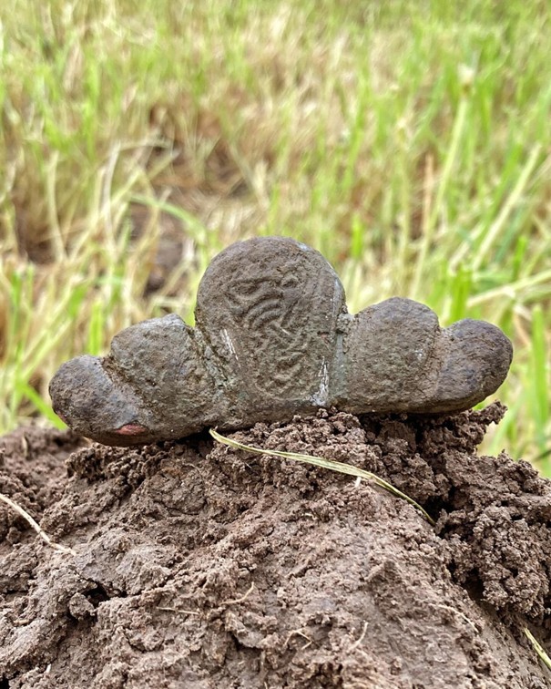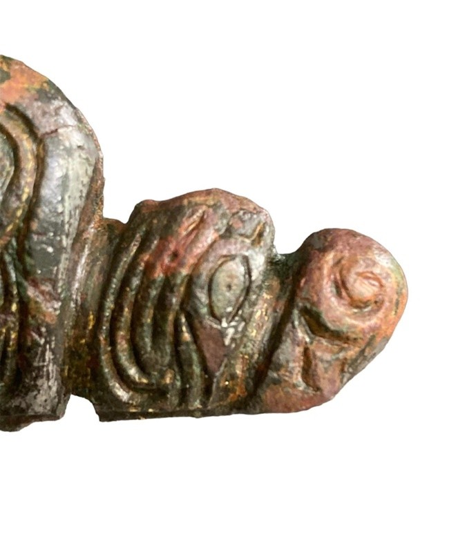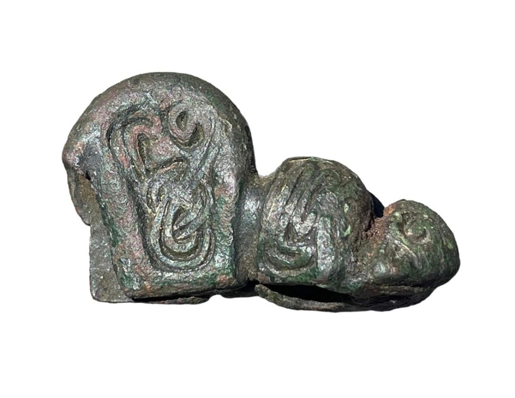 Ny Björn Gustafson merkte op: ‘It is like a transitional mix between Wheeler’s type III/Petersen R, i.e. two (more or less) beaked heads, and Wheeler’s type IV/Petersen O, i.e. “five knuckles” (vijflobbige type, red.) It is hard to tell wich way it is going in terms of design, but it has some traits (e.g. the snouts) in common with this W/IV/Petersen O pommel from North Yorkshire in the PAS (Portable Antiques Scheme, red.) database https://finds.org.uk/databse/artefacts/record/id/995783.’