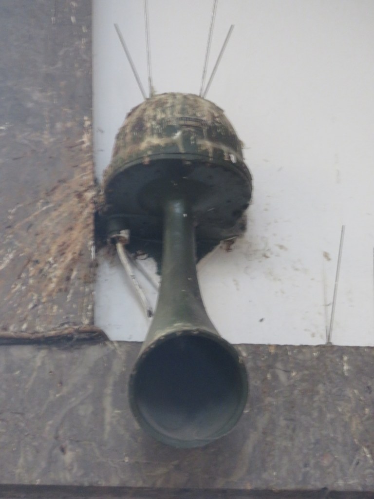 In de hoek, hoog boven de vloer valt mij eén van de leuke details op: de originele (?) omroephoorn van koper. Nogal bescheten door duiven die hier ook hun thuis hebben.