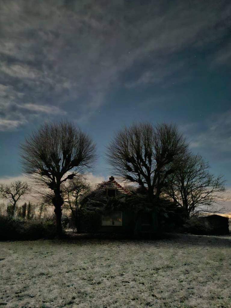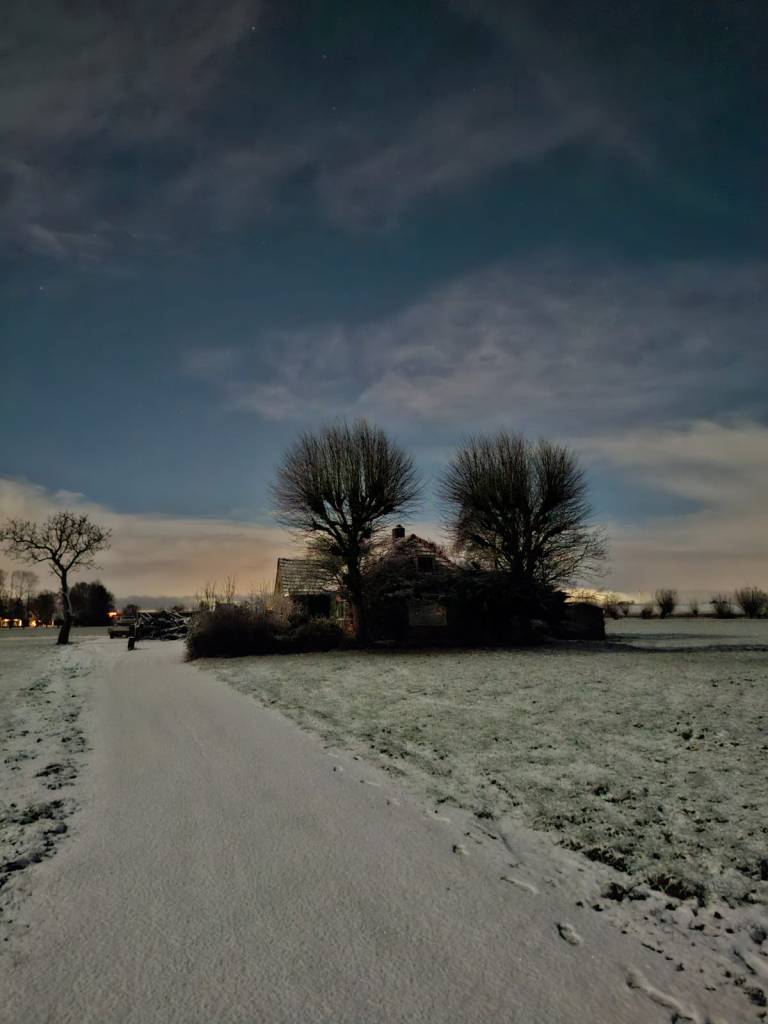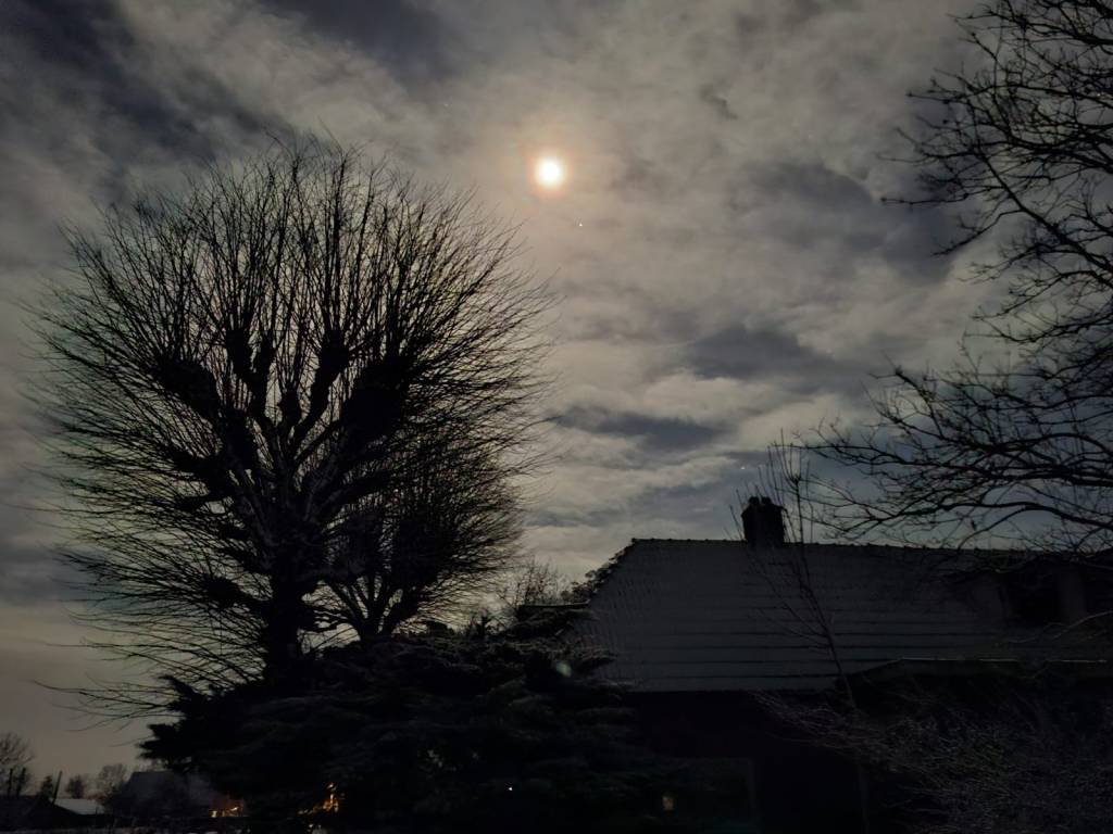 Hoe dan ook leidde het tot opmerkelijke beelden toen, op de avond van 3 januari, na een fikse sneeuwbui, het opklaarde. Het was nog één van die wensfoto’s welke ik wilde nemen voor mijn slotdeel “Herinneringen aan.” Dan zie je een beeld wat magisch is, maar krijg je dat ook op de foto? Mijn camera weigerde op dit punt. Als door een wonder ving de telefoon van mijn vrouw het mysterie. Inclusief sterren en al. De sneeuw is één ding, maar dan nét op de dag dat de volle maan er is – en dat het dan ook nog opklaart laat in de avond.